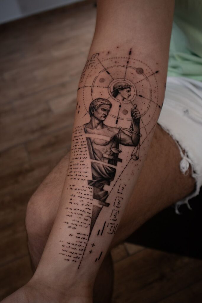 Some men choose a detailed libra goddess tattoo, reimagined as a warrior figure, while others go for a clean libra constellation tattoo across the or for a more subtle nod to their sign.