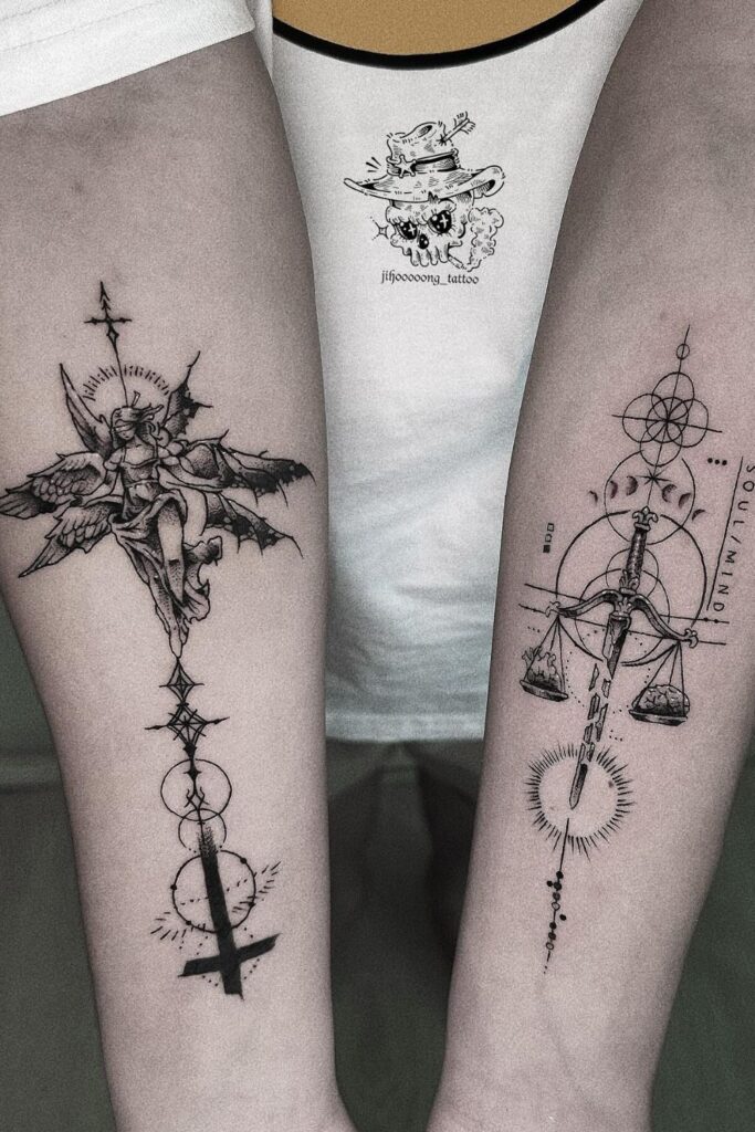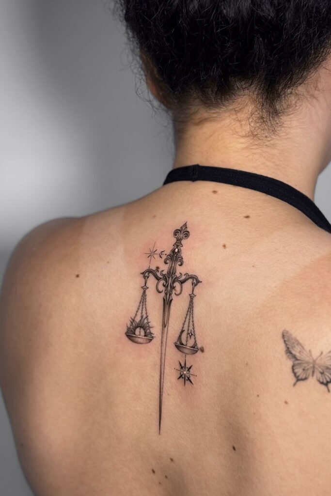 A classic choice is the libra scale tattoo, done in a geometric or realistic style, representing fairness and balance in a striking way.
