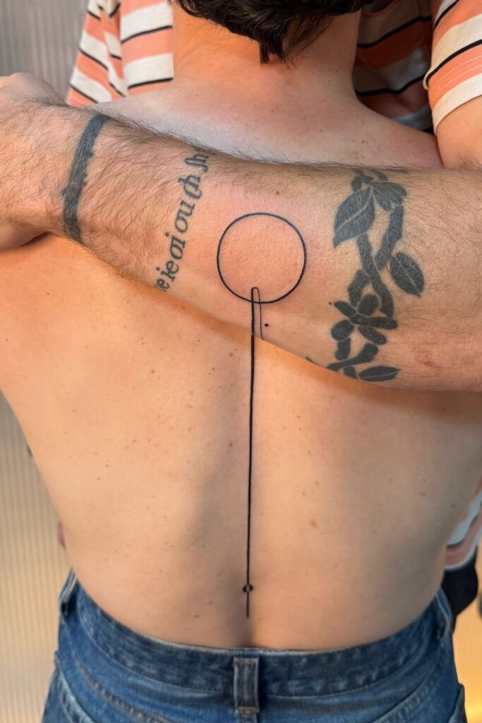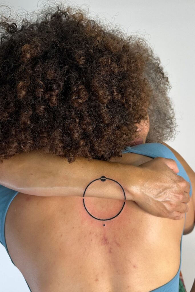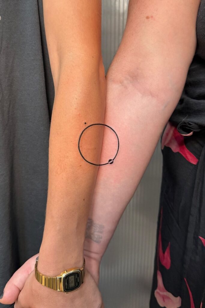A clean circle and line that align across two bodies, this is one of the most striking matching tattoos that connect.