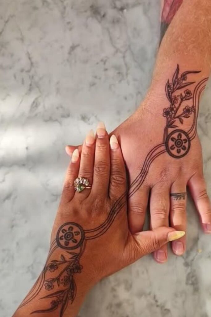 Some couples choose bold geometric patterns that flow seamlessly when they embrace, while others go for delicate tattoos that join together with simple lines or circles.