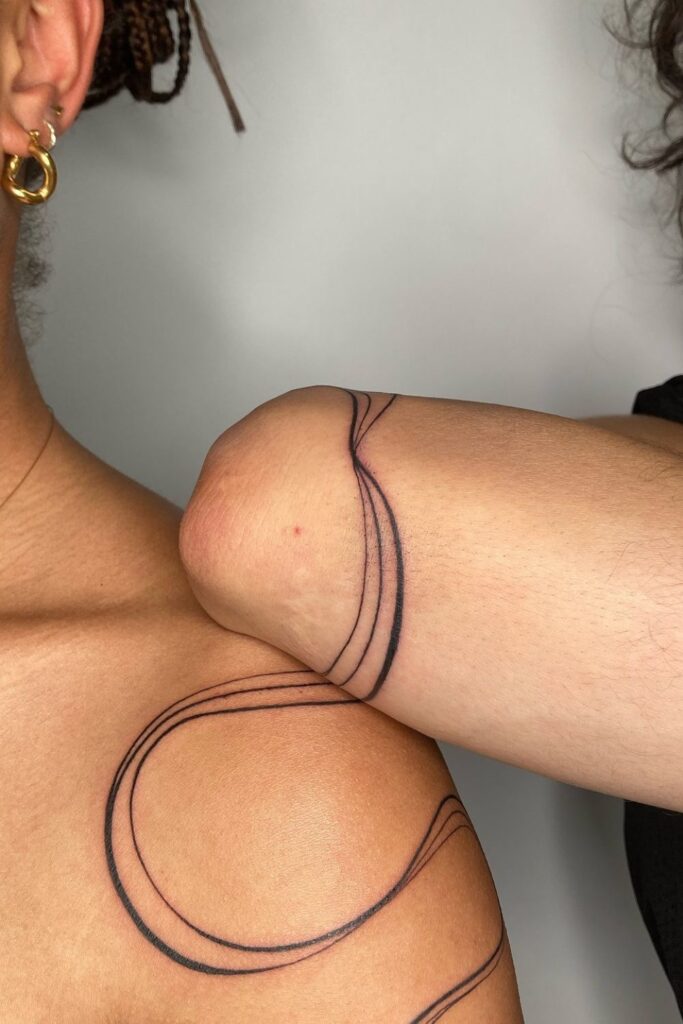 These bold, curving line tattoos for couples wrap around the arms and shoulders, creating art that comes alive when embraced.