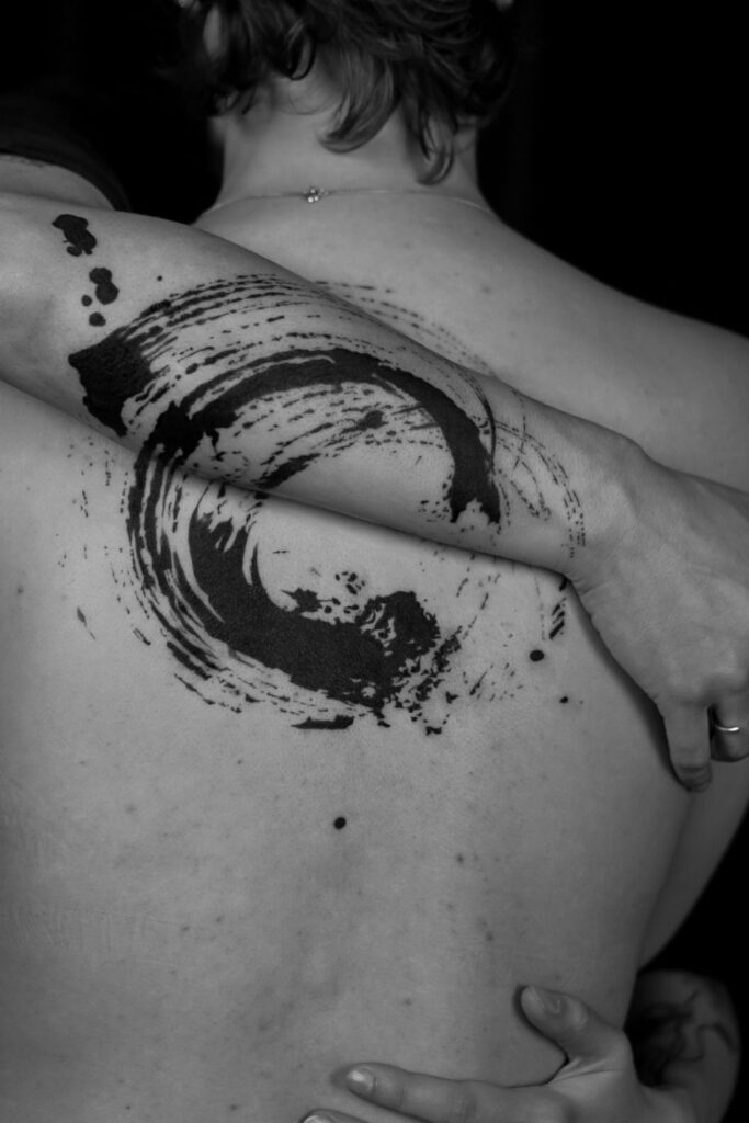 This bold brushstroke tattoo creates a striking circle of connection, symbolizing unity, eternity, and the flow of life.