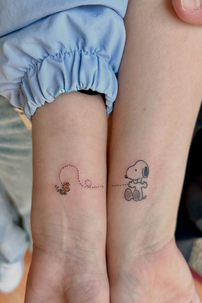 Some friends choose corresponding tattoos with a touch of fun, like Snoopy and Woodstock chasing each other across wrists, or tiny finger symbols that line up perfectly when hands meet.