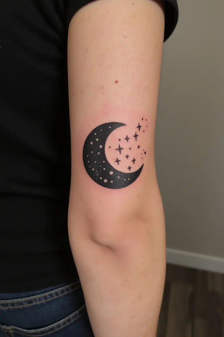This tattoo features a delicate crescent moon surrounded by a starry night sky.