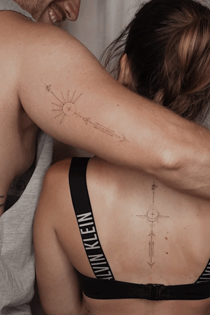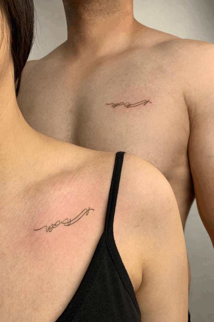 It’s a clever and stylish choice for modern couples who prefer strong, simple symbolism and couple tattoos unique in both meaning and design.