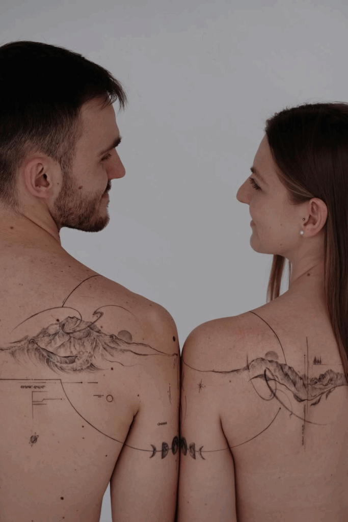 These breathtaking matching back tattoos form a unified landscape, waves, moons, mountains, and cosmic lines that connect across two bodies.