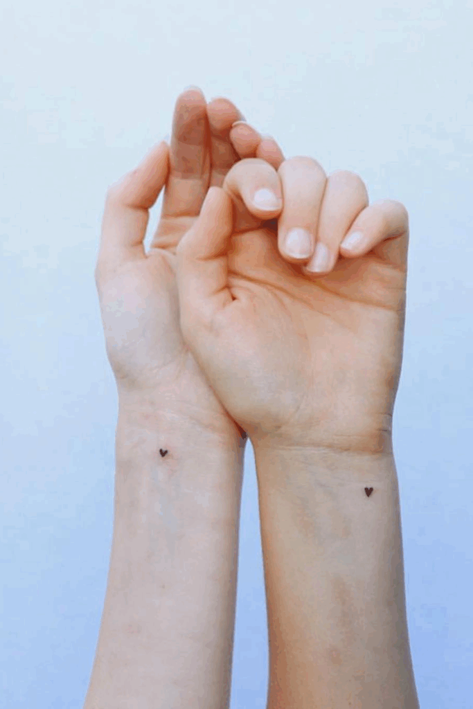 These matching tiny black heart tattoos on the wrists are sweet, timeless, and full of emotion.