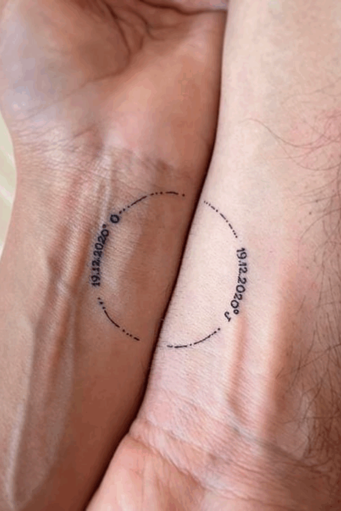 These matching coordinate tattoos form a subtle half-circle when placed together, symbolizing two people meeting at the perfect moment in time.