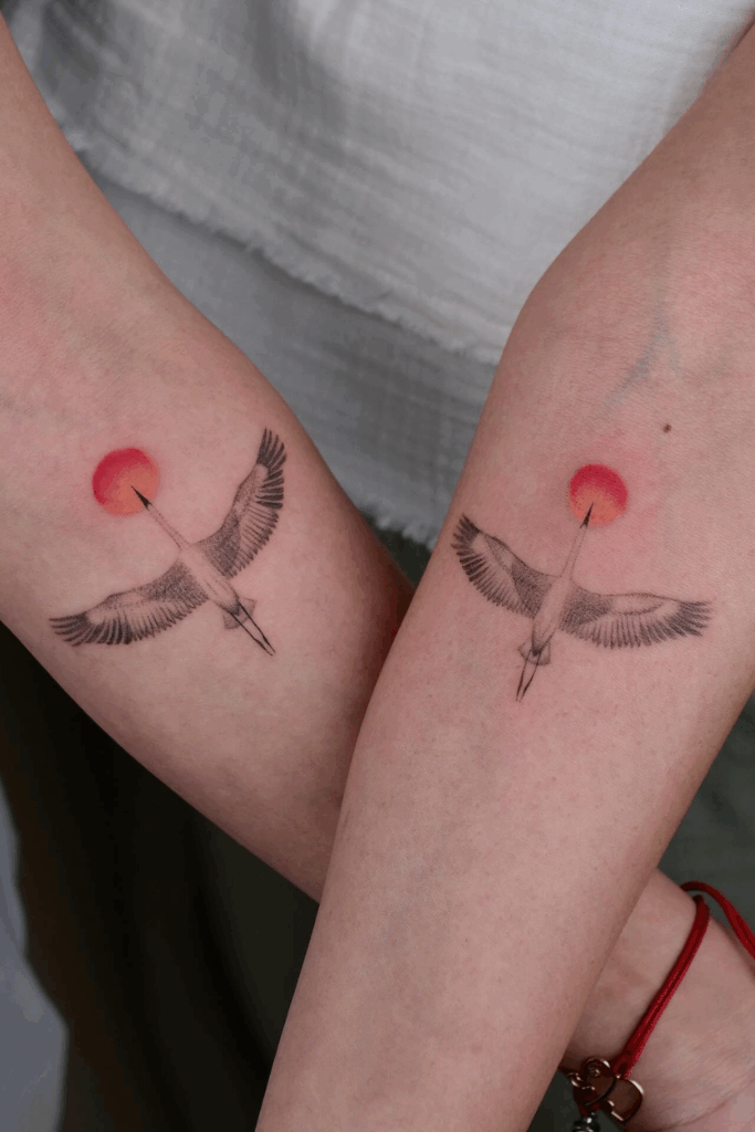 Soaring Together: Crane & Sun Matching Tattoos
