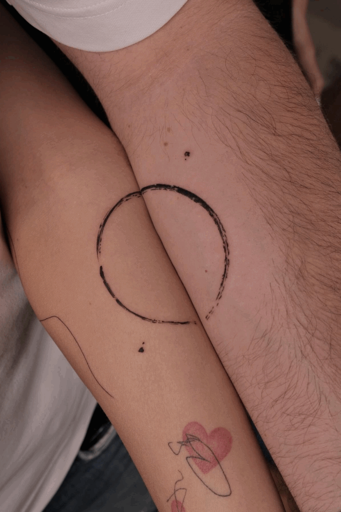 It s a cute minimal couple tattoo that works wonderfully for couples who believe they complete one another and want something soft, elegant, and meaningful.