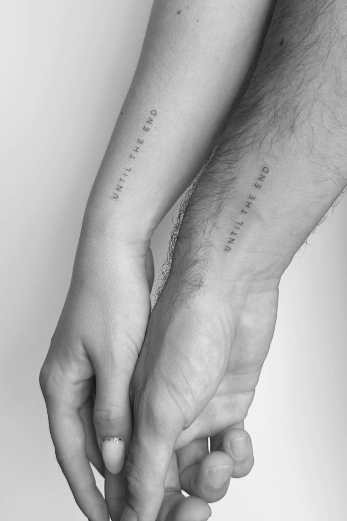 Simple yet incredibly powerful, these matching forearm tattoos that read âUntil the Endâ speak to a promise that lasts a lifetime.