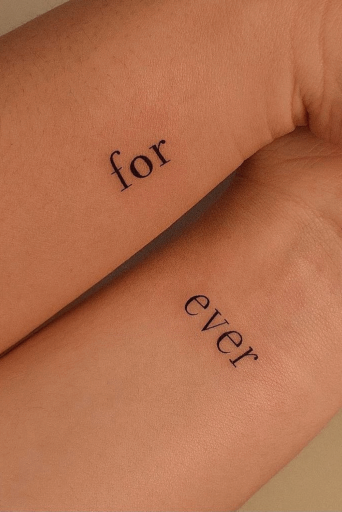 This clever two-part tattoo splits the word âforeverâ between two people, âforâ on one, âeverâ on the other.
