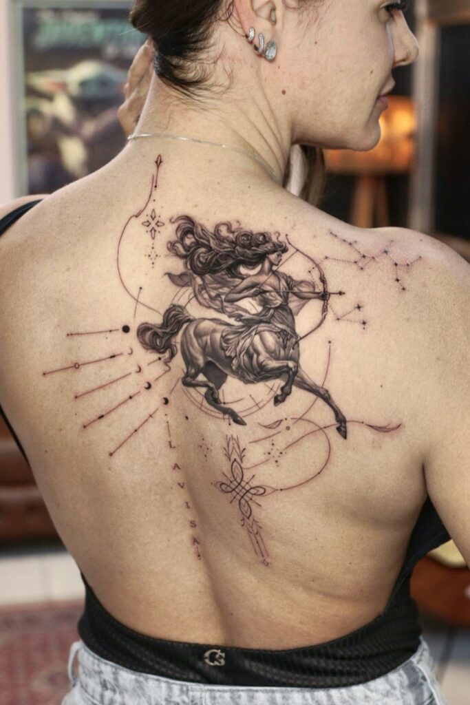 For larger statement pieces, such as a centaur or goddess, a back, thigh, or Sagittarius spine tattoo can create a breathtaking result.