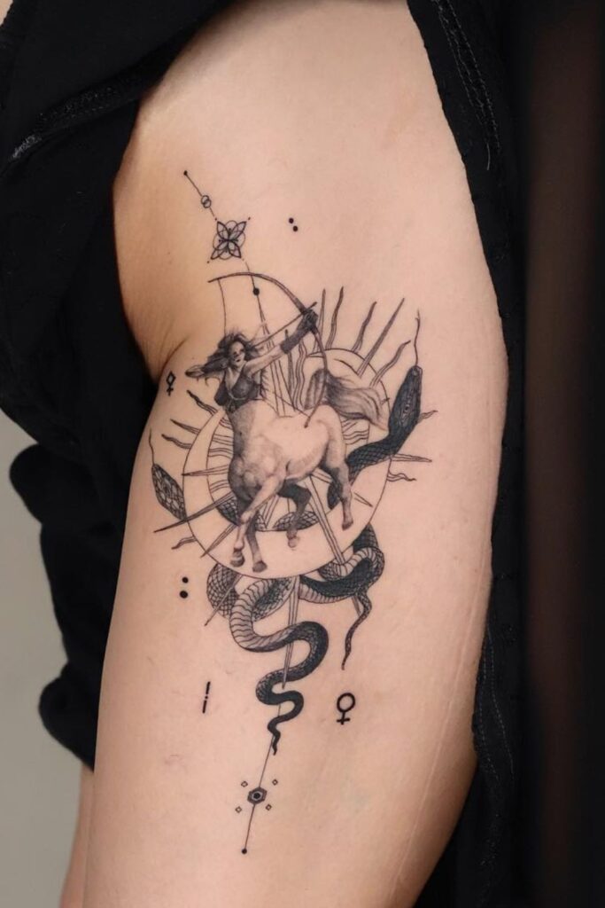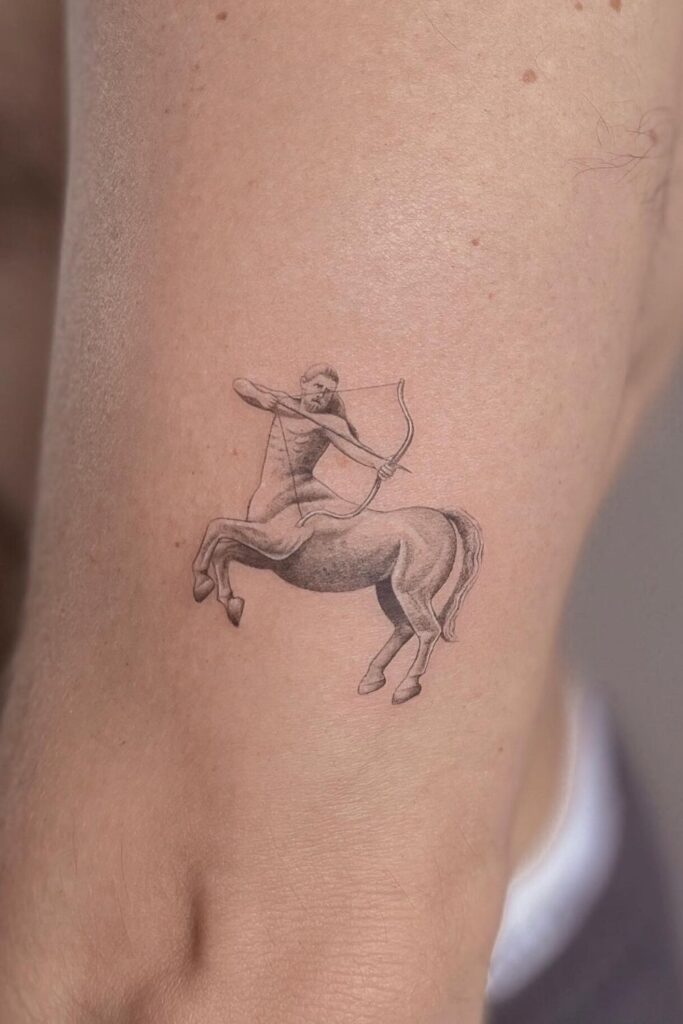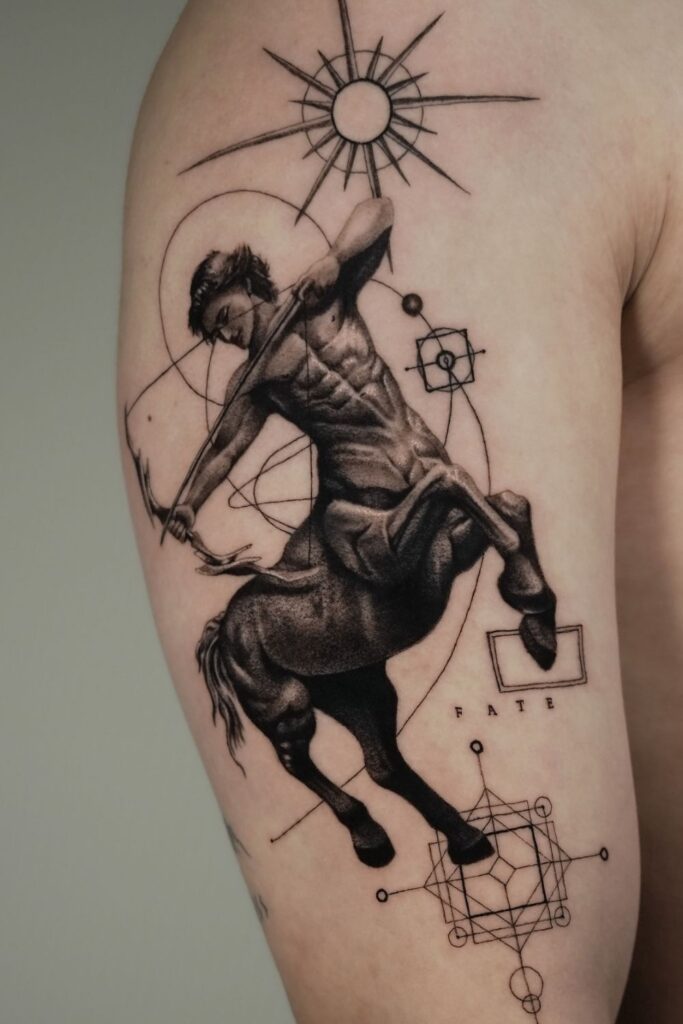 A centaur tattoo Sagittarius design embodies wisdom, strength, and fierce independence.