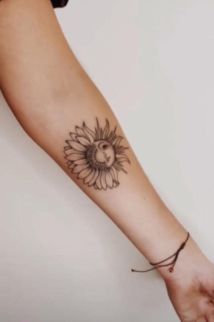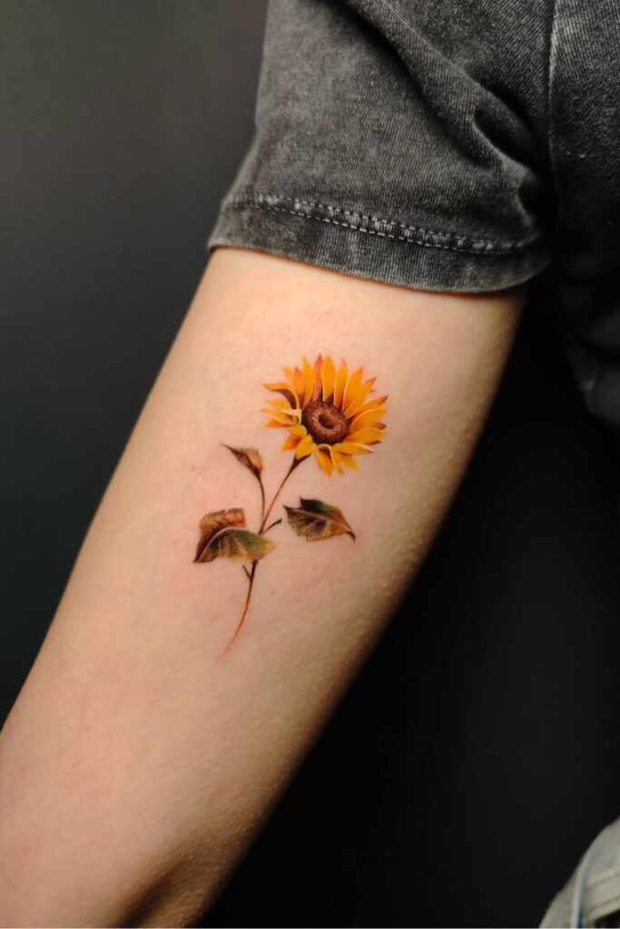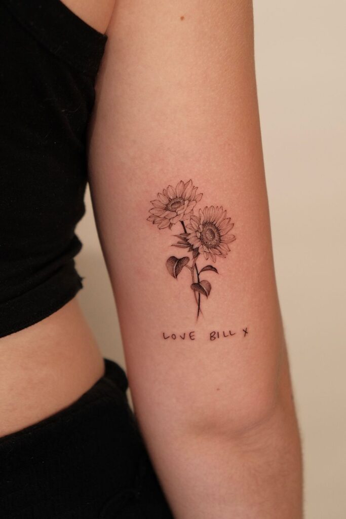 A sunflower tattoo above the elbow feels both trendy and deeply expressive.
