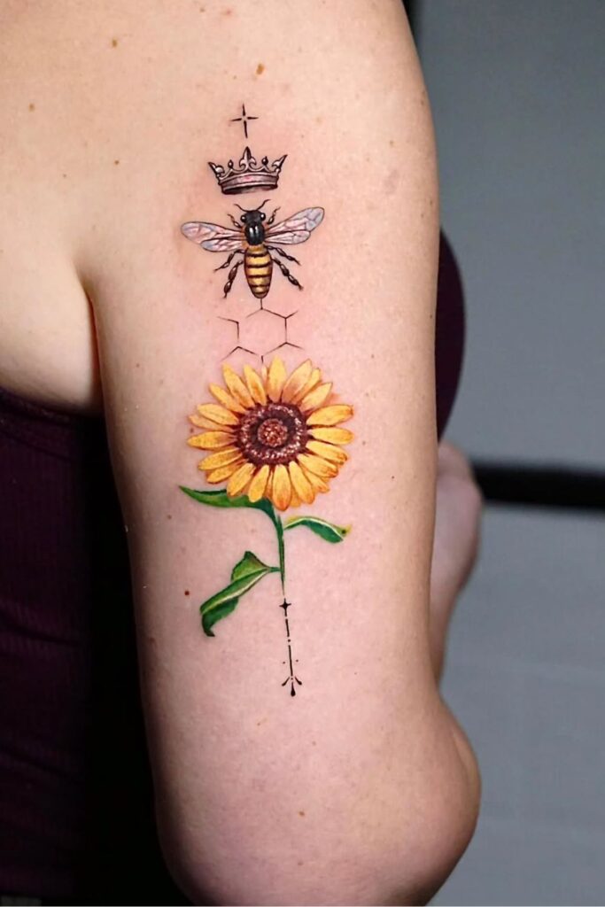 This vibrant sunflower tattoo design combines a golden bloom with a crowned bee, geometry, and subtle celestial symbols.