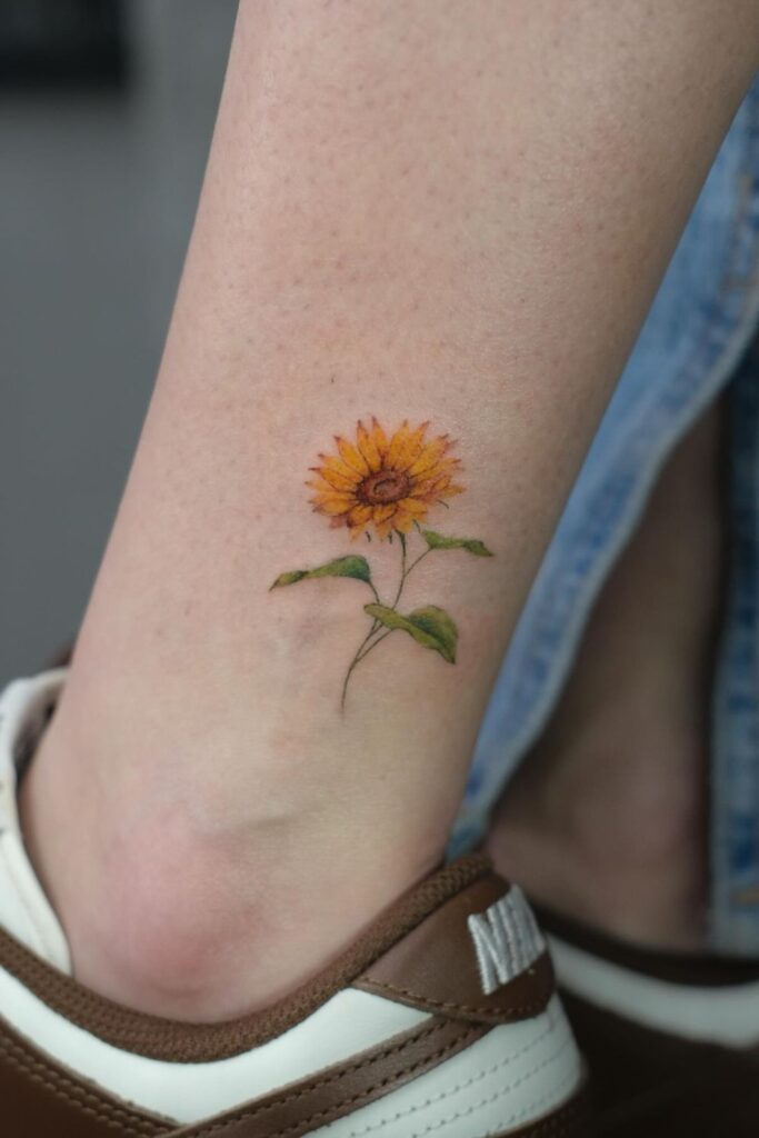 This charming small sunflower tattoo on the ankle is a symbol of light you can carry with every step.