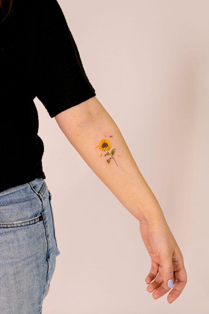 This clean and vibrant small sunflower tattoo on the inner forearm stands out with its crisp lines and floating petals.
