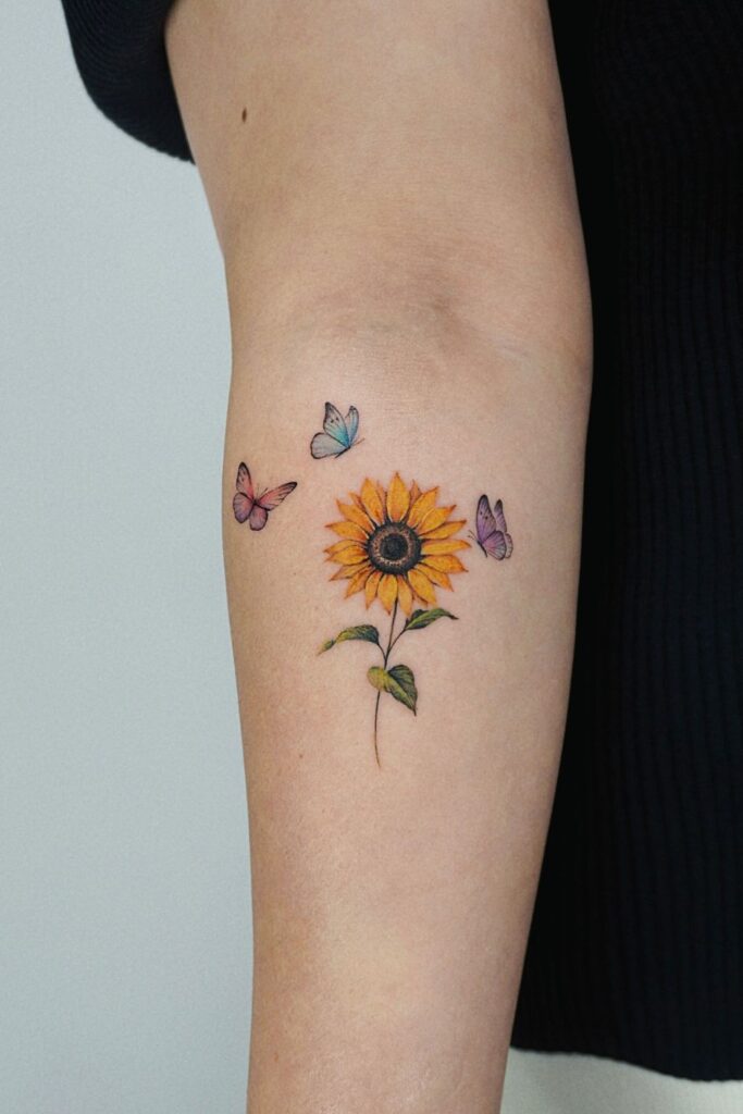 Surrounded by pastel butterflies, this sunflower tattoo design feels whimsical and alive.