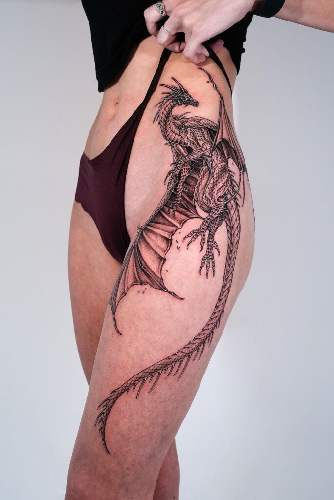 A detailed dragon stretches across the thigh and hip, symbolizing strength, protection, and fearlessness.