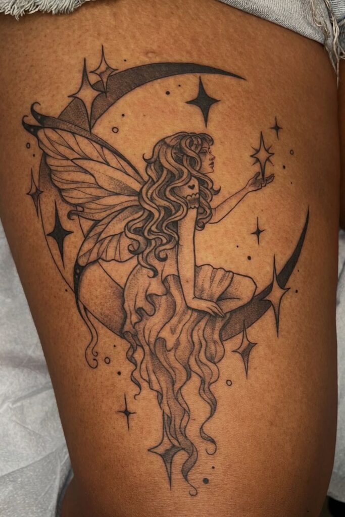 A whimsical design showcasing a fairy sitting on a crescent moon surrounded by stars.