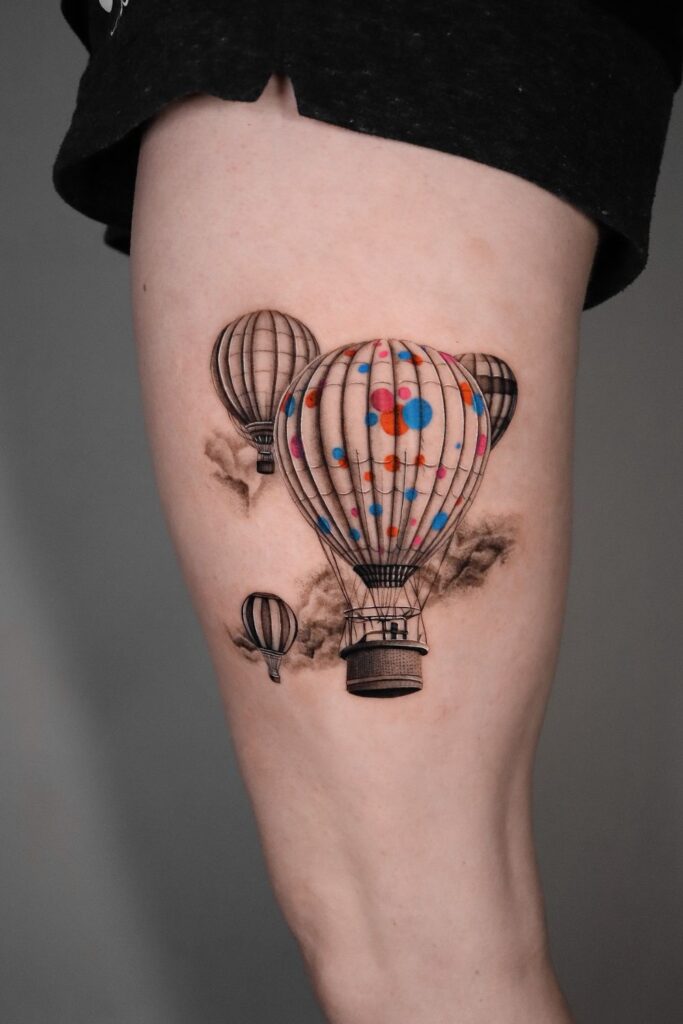 This colorful hot air balloon tattoo symbolizes freedom, dreams, and endless possibilities.
