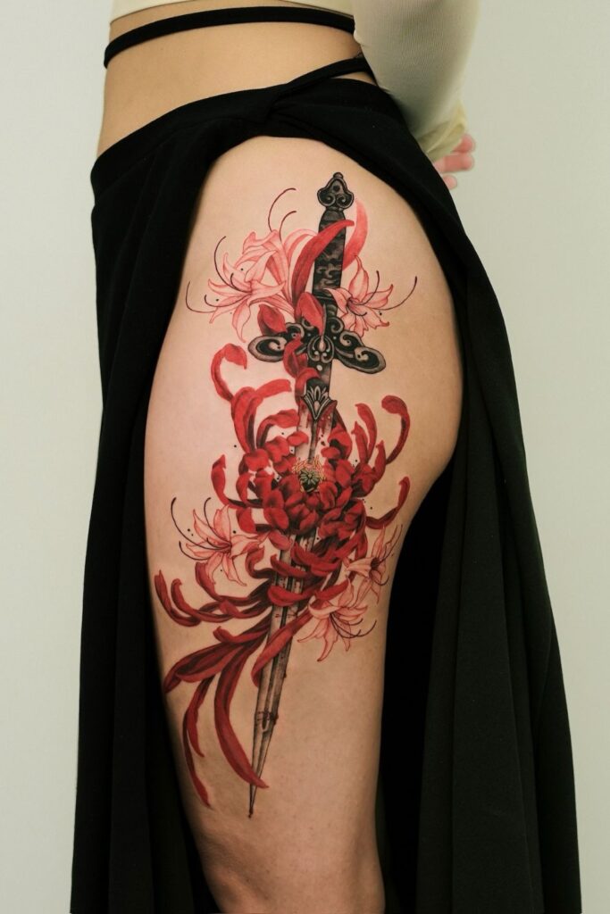 This striking piece blends vibrant red flowers with a black ornamental sword, symbolizing courage, passion, and resilience.
