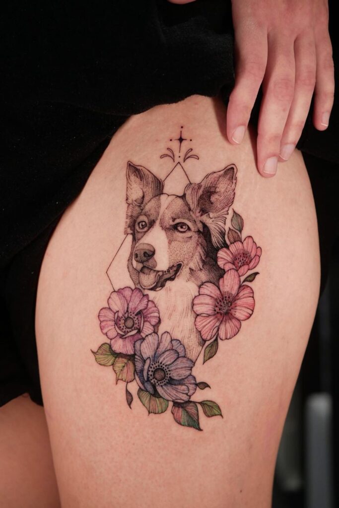 The realistic dog portrait surrounded by soft flowers represents loyalty, love, and companionship.