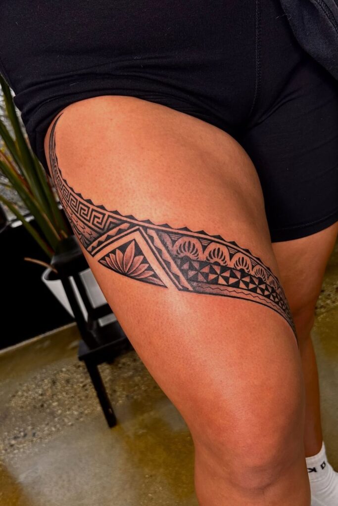A sharp, patterned thigh band inspired by tribal art, symbolizing unity, resilience, and empowerment.