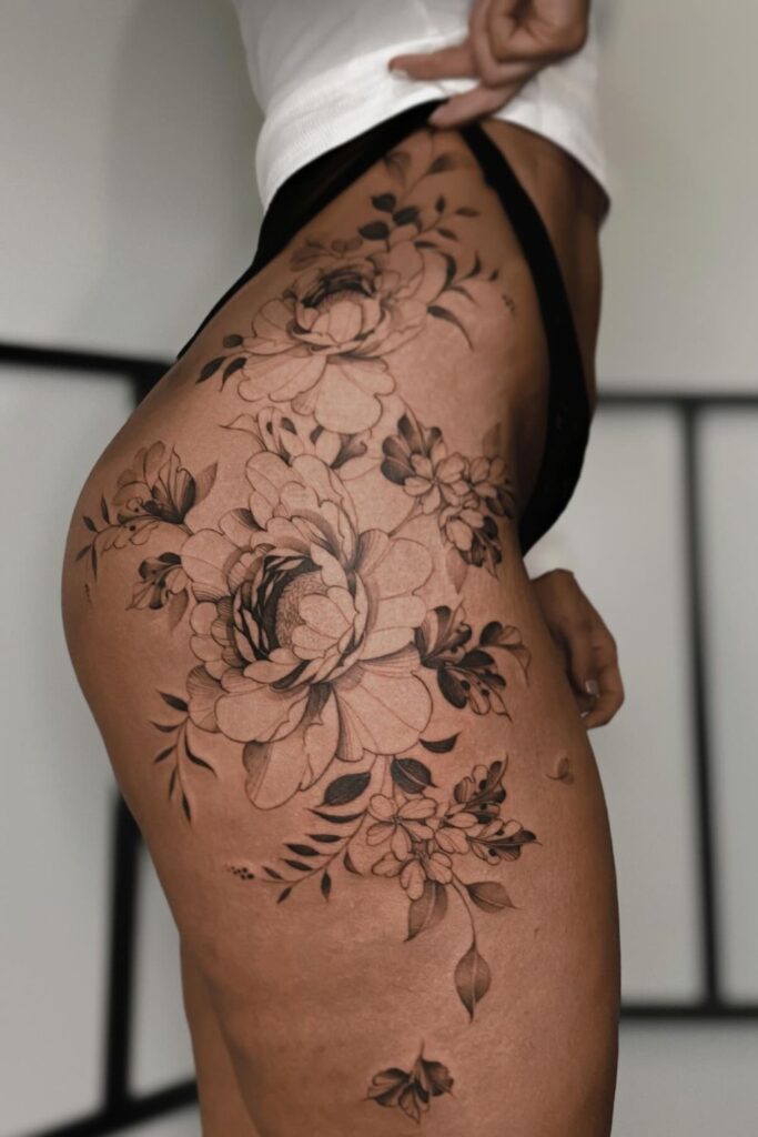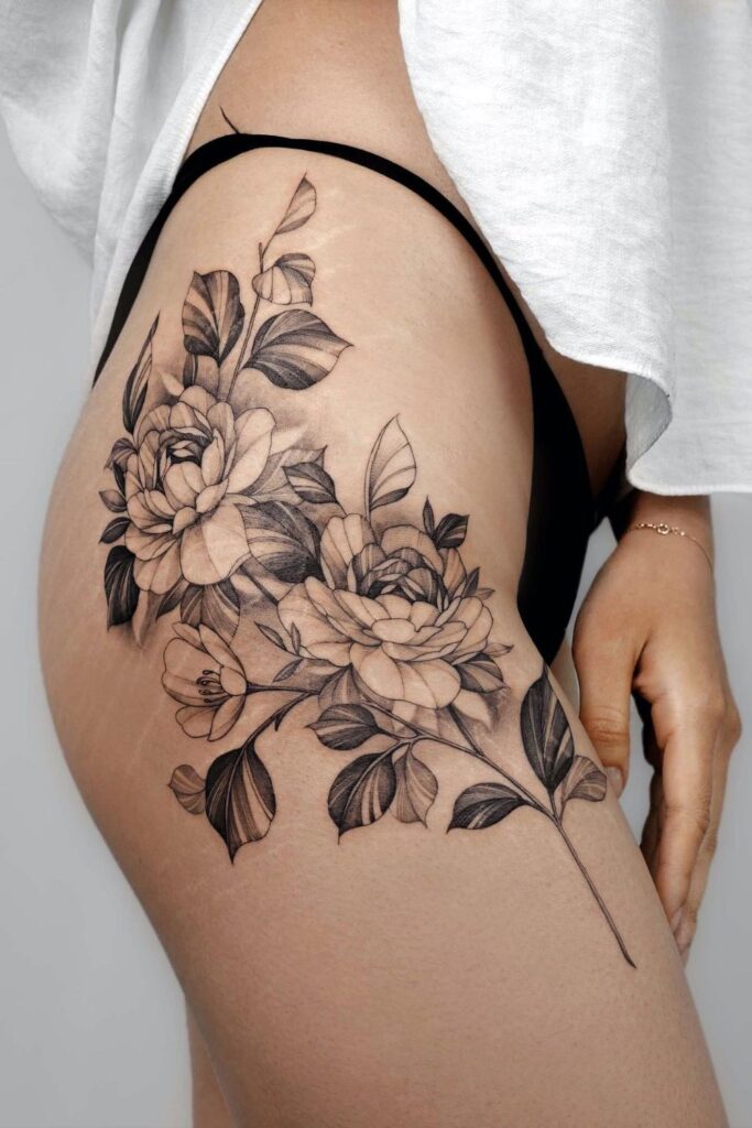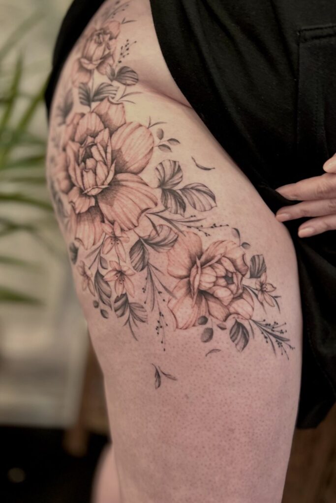 A graceful floral thigh tattoo with beautifully shaded peonies flowing along the thigh.