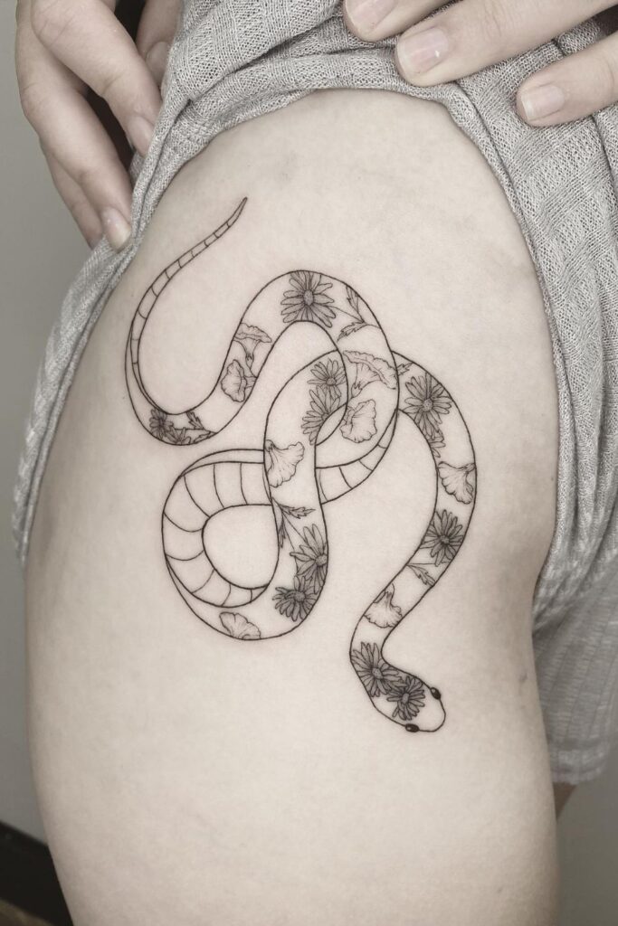 The snake often represents transformation and rebirth, while flowers add a touch of softness and femininity.