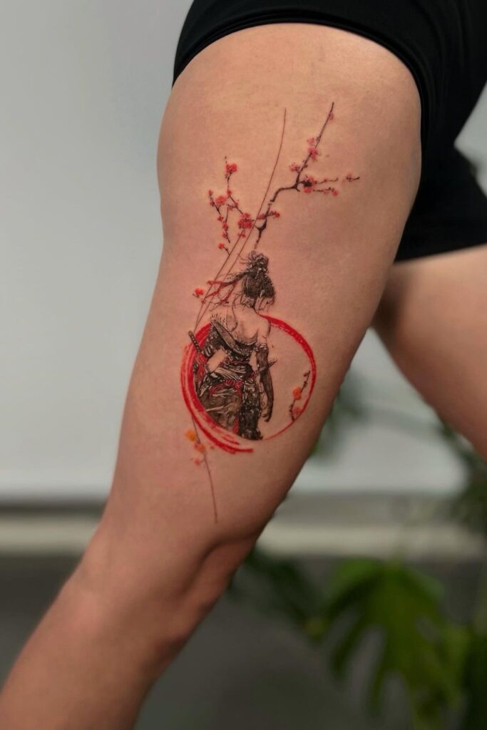 Featuring a fierce female warrior with Japanese-inspired elements, this tattoo represents courage, resilience, and inner strength.