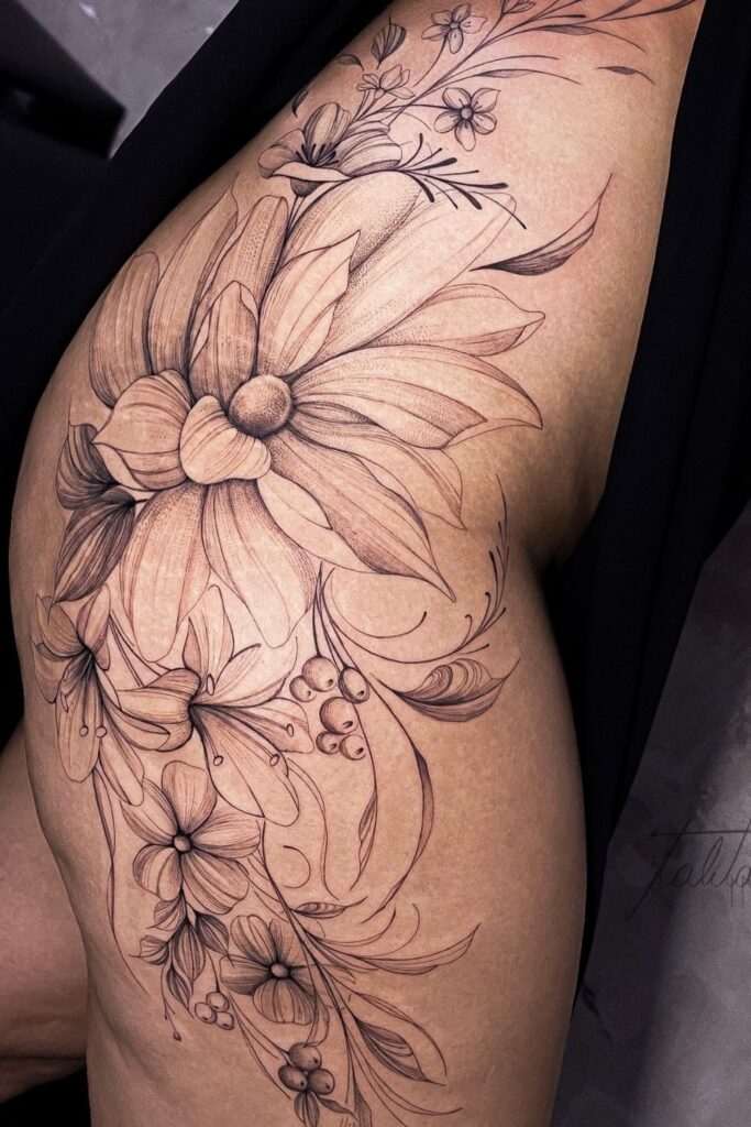Featuring large, detailed flowers and lush leaves, this design flows beautifully across the hip and upper thigh.