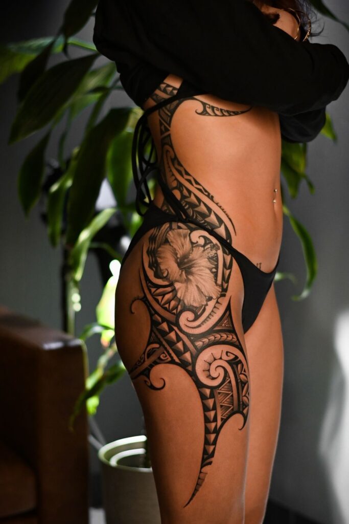 This striking tribal tattoo flows from the hip down the thigh, blending bold patterns with a delicate hibiscus flower.