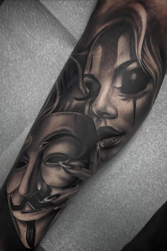 This stunning black and grey realism tattoo by dermaldelights_tattoo captures a woman s serene face beside the iconic Guy Fawkes mask, blending themes of identity, rebellion, and mystery.