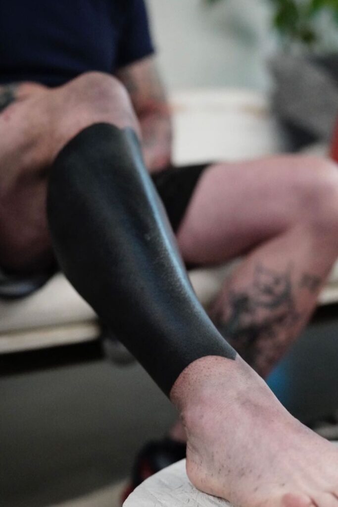 A full blackout lower leg tattoo like this is as minimalist as it is intense.