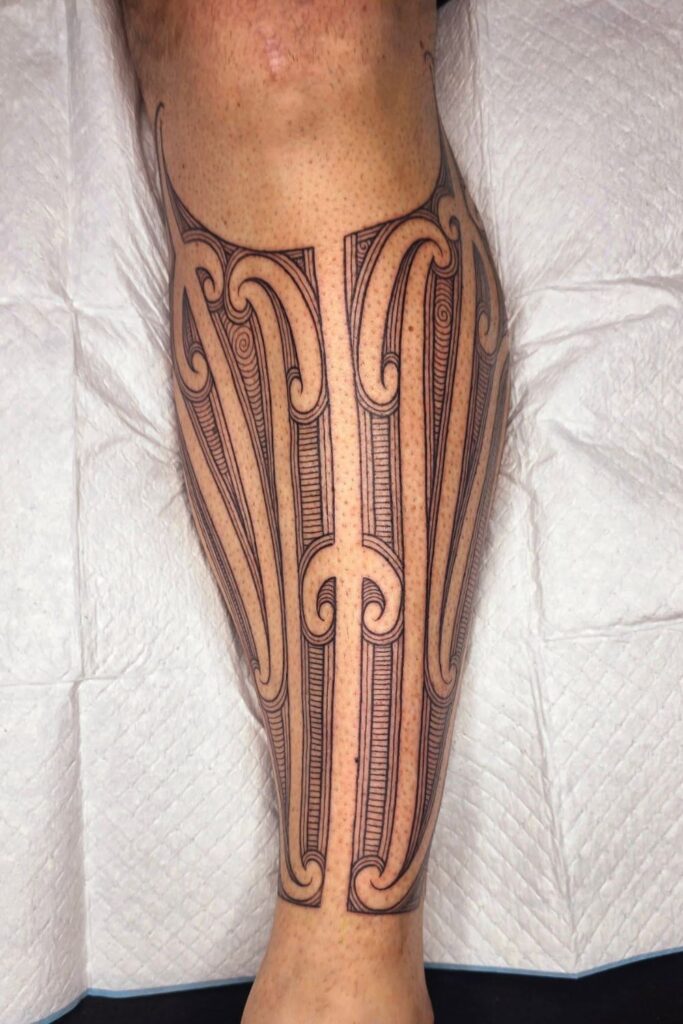 This bold leg tattoo by 22b_ink takes cues from traditional Maori art, with elongated curves and symmetrical spirals flowing naturally with the calf s shape.