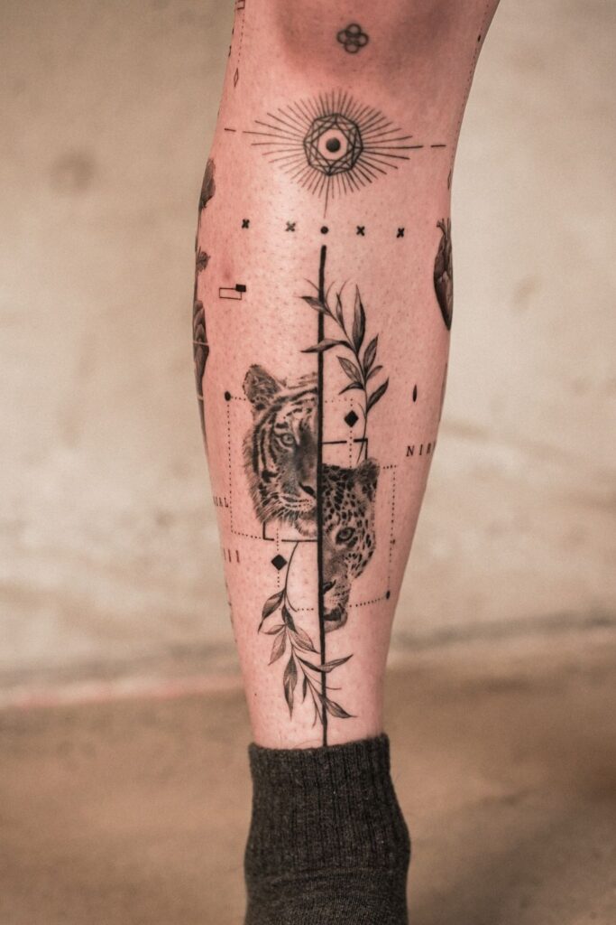 This lower leg tattoo by jz_inker brings together a tiger and a leopard in a mirrored vertical design, separated by a delicate branch and geometric accents.