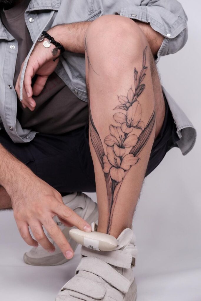 This elegant floral tattoo by lasstattoo wraps vertically along the calf, featuring a gladiolus flower known for representing strength of character and moral integrity.
