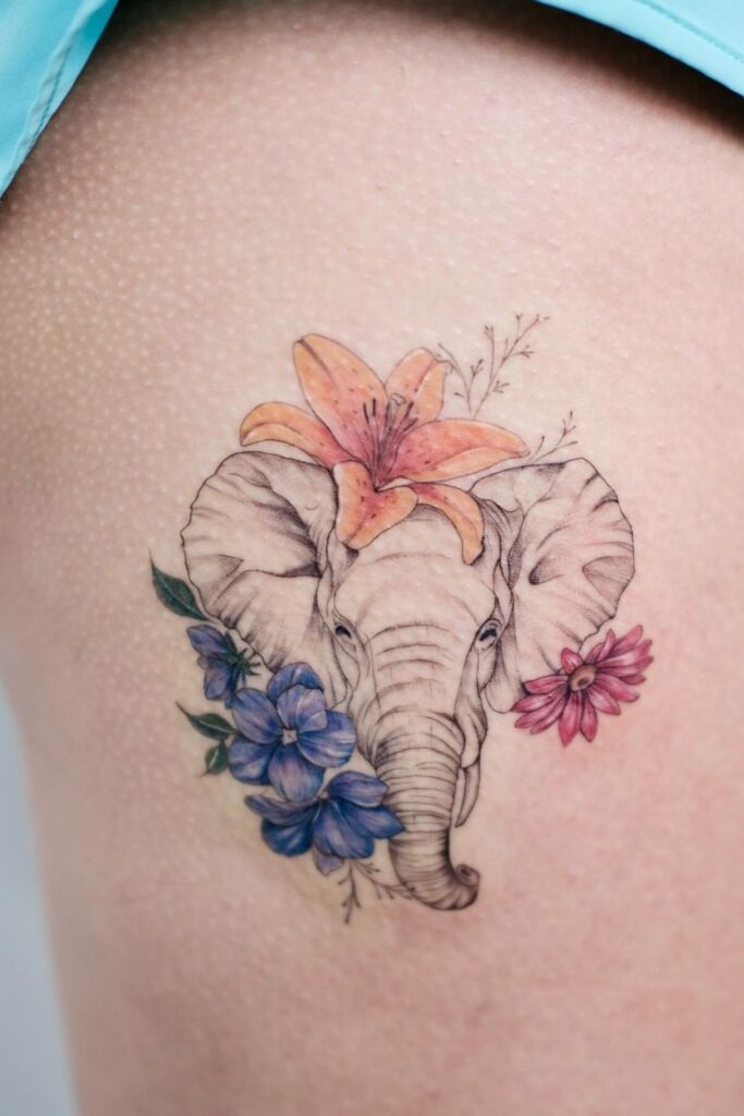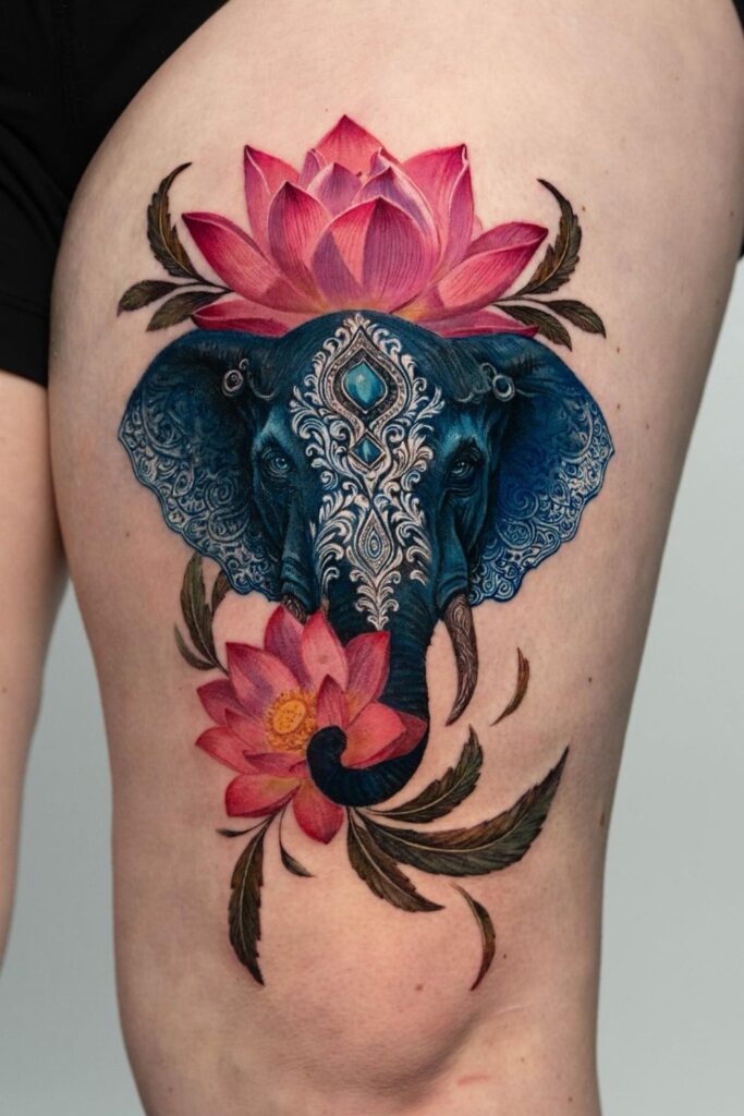 A vibrant elephant tattoo with flowers, featuring a lotus for purity and enlightenment, paired with rich, jewel-toned details.