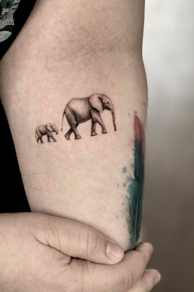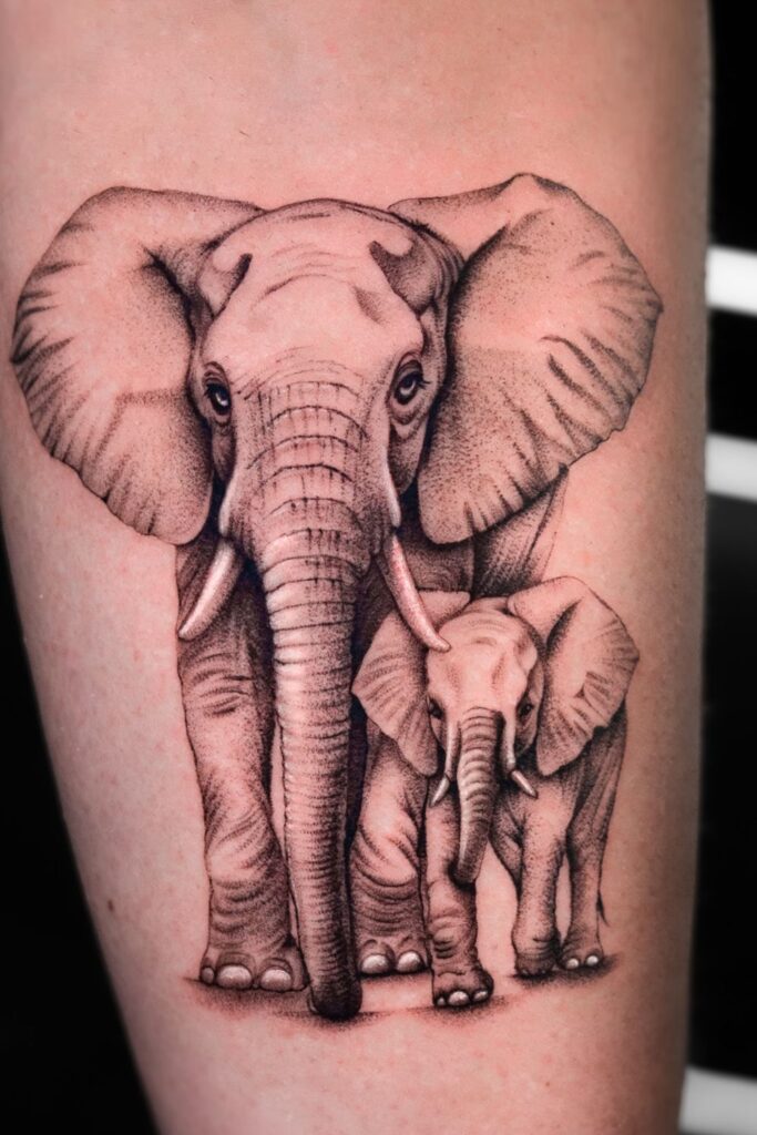 A touching design featuring two elephants walking together, this tattoo represents deep family bonds, loyalty, and protection.