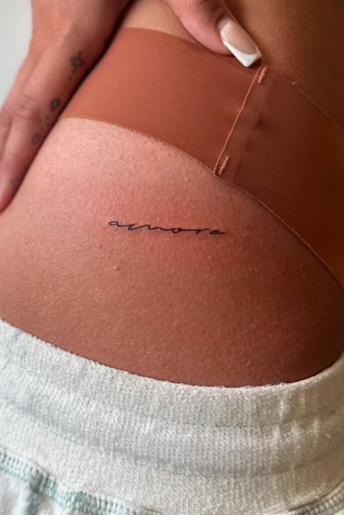 “Amore” meaning love, written in an elegant, almost whispering script, sits delicately on the hip.