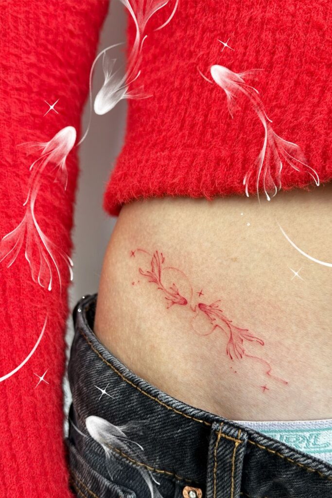 Bold yet delicate, this red ink dainty hip tattoo by mindori_dreams features two koi fish gracefully swimming in a cosmic embrace.
