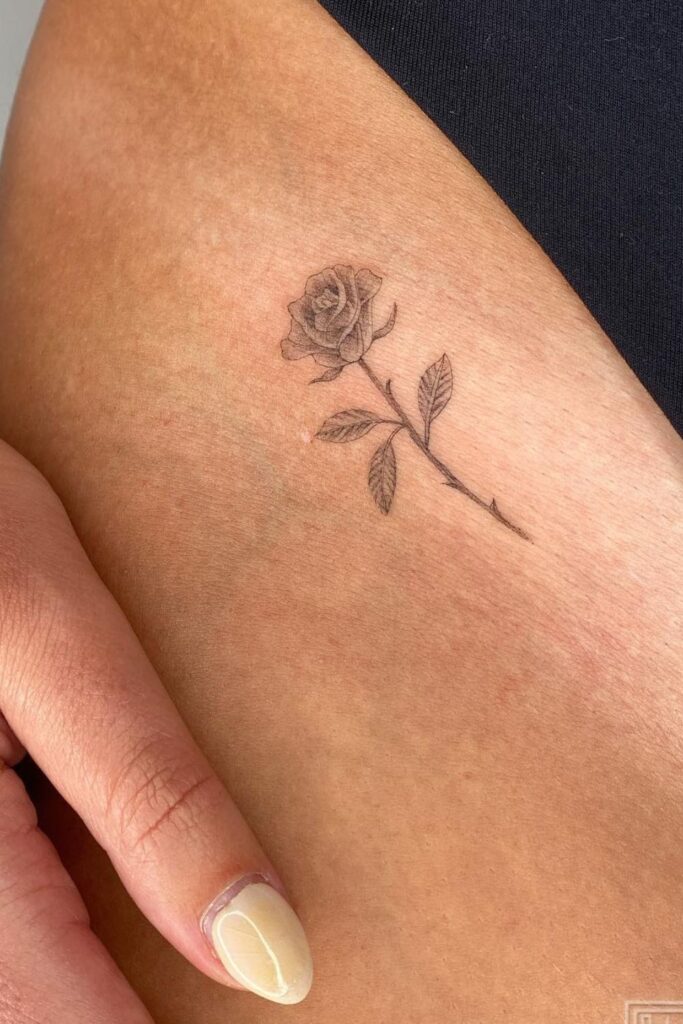 This finely detailed rose by west4tattoo is a perfect example of how minimal hip tattoos can still feel rich and meaningful.