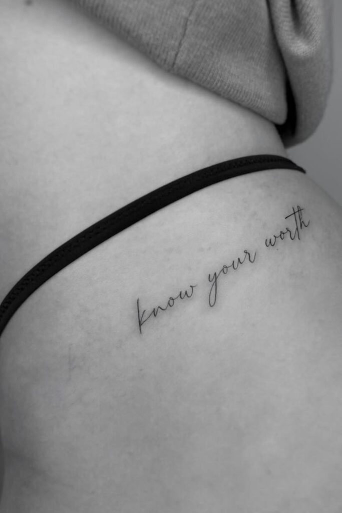 Know Your Worth: A Dainty Script Hip Tattoo