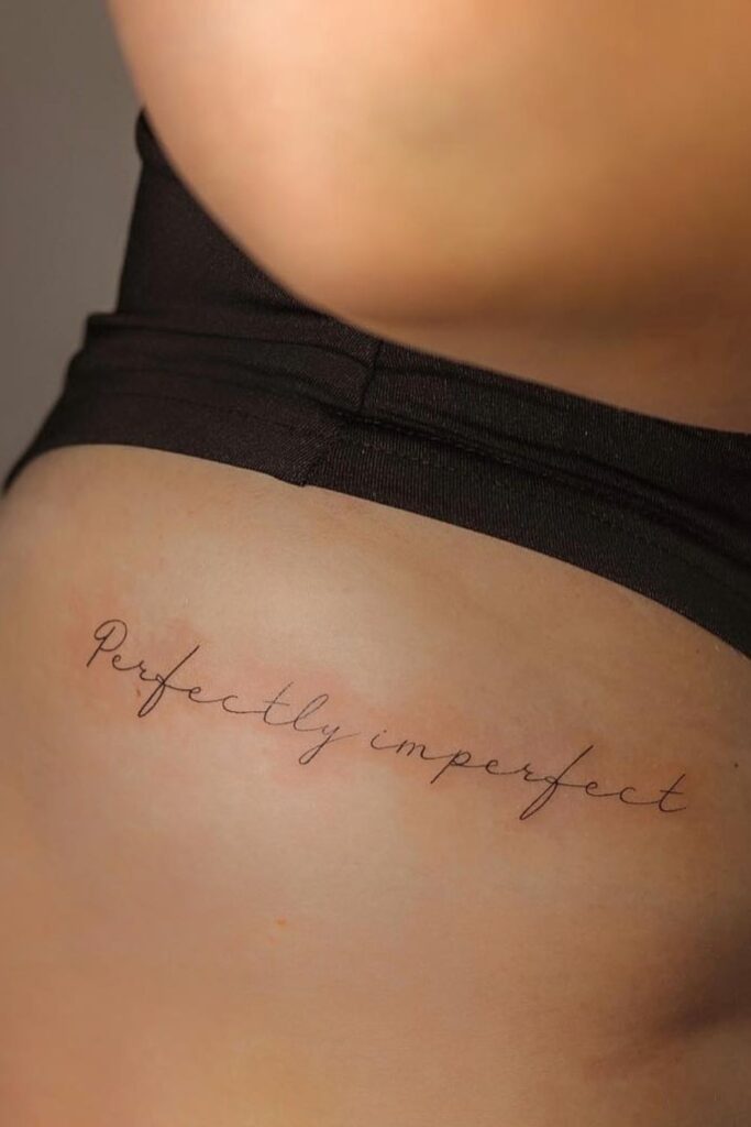 This is an ideal dainty hip tattoo women wordspiece for someone on a self-love journey or who values authenticity over perfection.