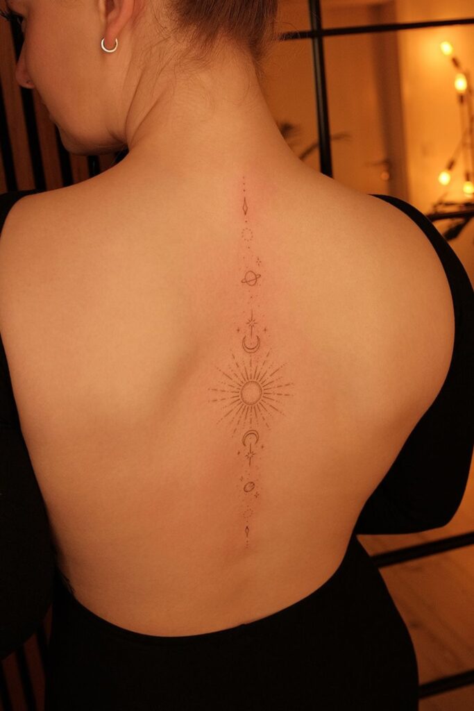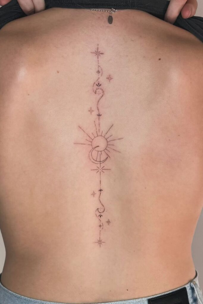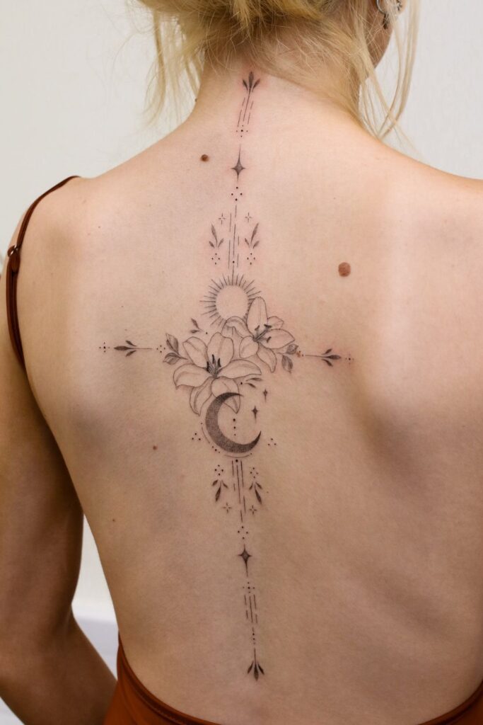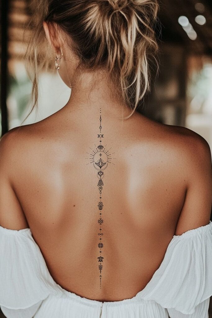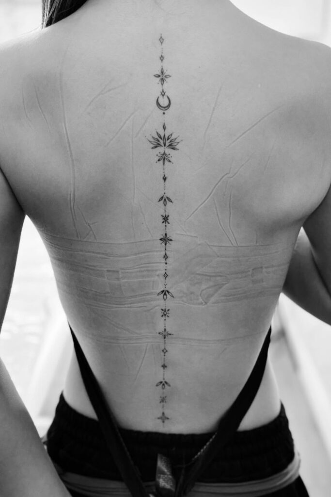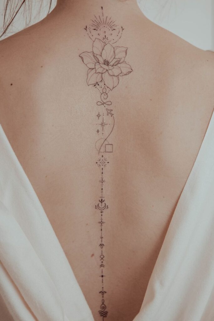 Perfect for spiritual souls who love elegant spine tattoos for women that are both meaningful and mesmerizing.