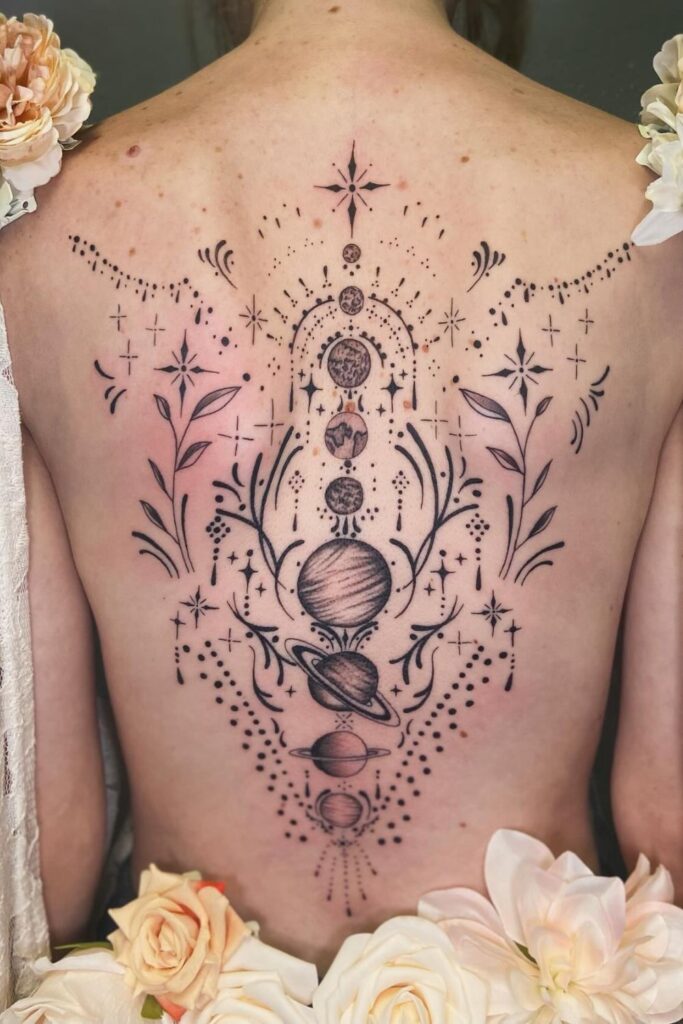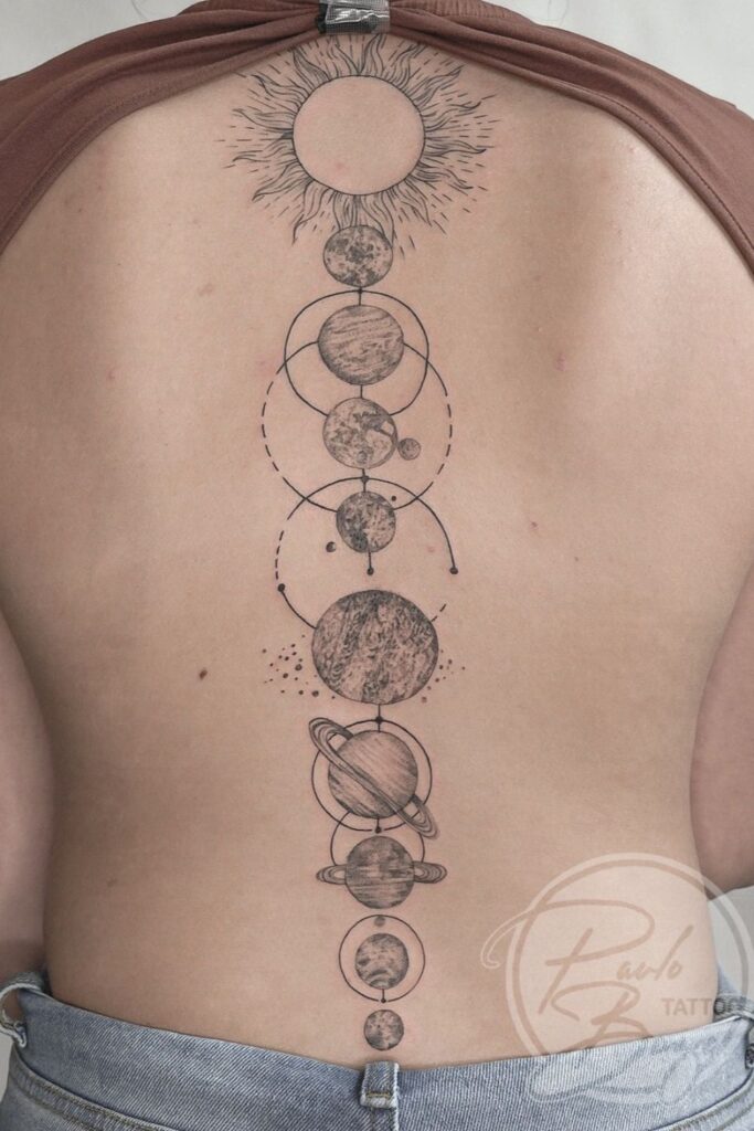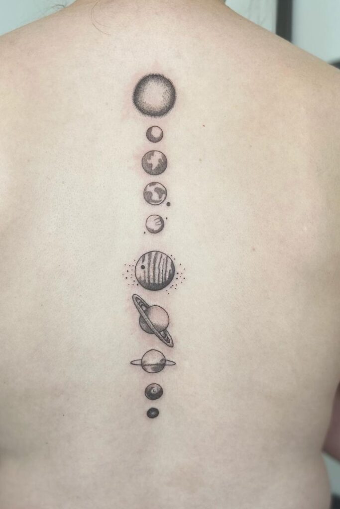 This tattoo by molssamsontattoo arranges the planets in perfect order down the spine, shaded with soft precision.