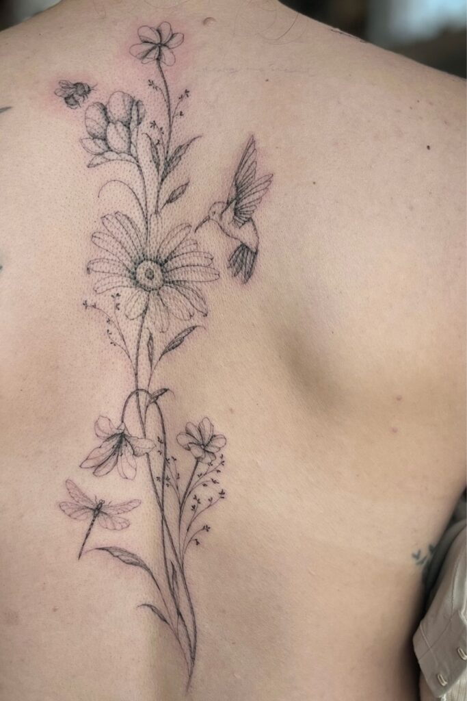 With daisies, dragonflies, bees, and even a hummingbird, this spine tattoo by finelinebaddie captures a moment in nature s dance.