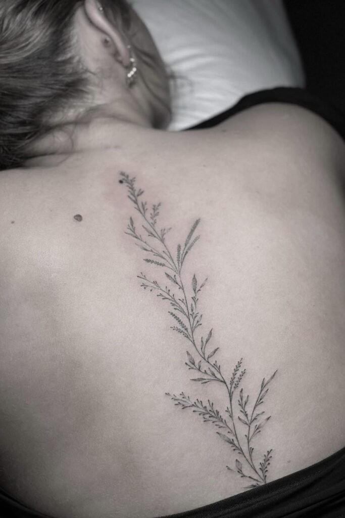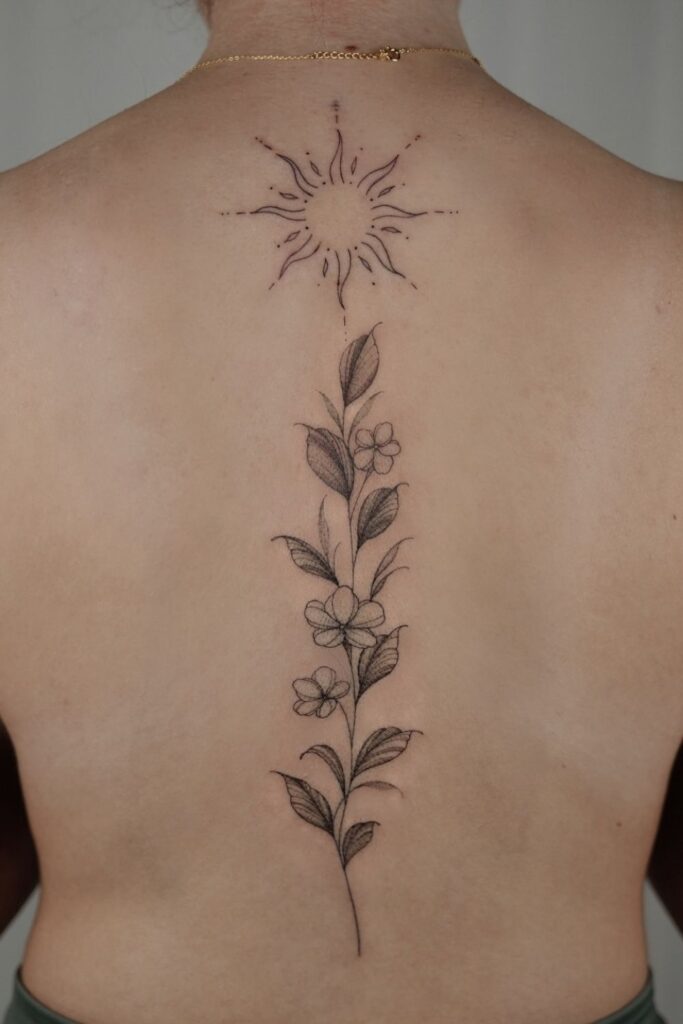 This tattoo is ideal for someone who connects with earth energy and wants a dainty spine tattoo for women that feels organic and effortless.